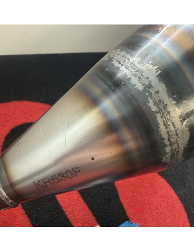 Le pot d'échappement KRM 70-80cc pour moteur AM6 est constitué de 15 pièces en tôle d'acier d'épaisseur 0.8 mm. Sa technique de fabrication est entièrement manuelle, chacune des pièces sont roulées puis soudées bord à bord au chalumeau avant d'être façonnées manuellement au marteau dans les ateliers KRM. Le pot KRM 70-80cc est très puissants et prévu pour de grosses configurations type 70cc, 75cc et même 80cc. Il est destiné à une utilisation en compétition run ou piste uniquement. Il est l’aboutissement de mois de travail au banc d’essais afin offrir la meilleure des performances.