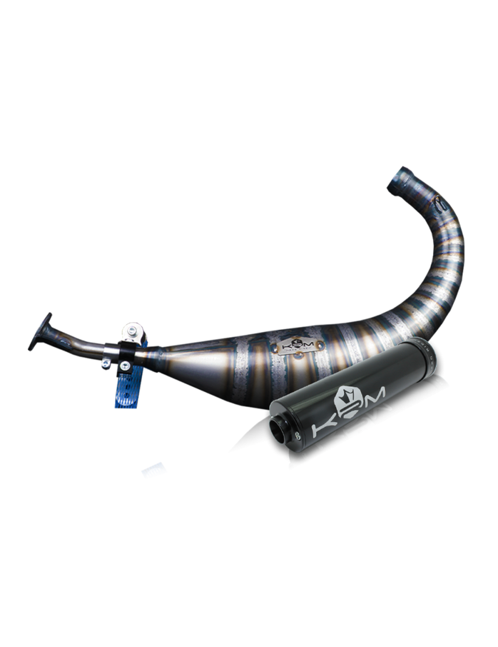 Le pot d'échappement KRM 100-115cc pour moteur Minarelli AM6 est constitué de 18 pièces en tôle d'acier d'épaisseur 0.8 mm. Sa technique de fabrication est entièrement manuelle, chacune des pièces sont roulées puis soudées bord à bord au chalumeau avant d'être façonnées manuellement au marteau. Le pot KRM 100-115cc est très coupleux et puissant et prévu pour de très grosses configurations type 100cc 2fast ou 115cc LMR. Il est destiné à une utilisation en compétition run ou piste uniquement. Il est l’aboutissement de mois de travail au banc d’essais afin offrir la meilleure des performances.