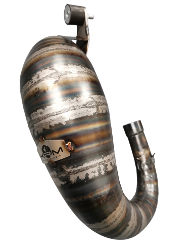 Le pot d'échappement KRM 80-90cc pour moteur AM6 est constitué de 17 pièces en tôle d'acier d'épaisseur 0.8 mm. Sa technique de fabrication est entièrement manuelle, chacune des pièces sont roulées puis soudées bord à bord au chalumeau avant d'être façonnées manuellement au marteau dans les ateliers KRM. Le pot KRM 80-90cc est très puissants et prévu pour de grosses configurations. Il est destiné à une utilisation en compétition run ou piste uniquement. Il est l’aboutissement de mois de travail au banc d’essais afin offrir la meilleure des performances.