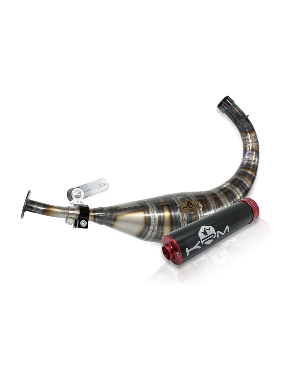 Le pot d'échappement KRM 80-90cc pour moteur AM6 est constitué de 15 pièces en tôle d'acier d'épaisseur 0.8 mm. Sa technique de fabrication est entièrement manuelle, chacune des pièces sont roulées puis soudées bord à bord au chalumeau avant d'être façonnées manuellement au marteau dans les ateliers KRM. Le pot KRM 80-90cc est très puissants et prévu pour de grosses configurations type 86cc Top performance. Il est destiné à une utilisation en compétition run ou piste uniquement. Il est l’aboutissement de mois de travail au banc d’essais afin offrir la meilleure des performances.