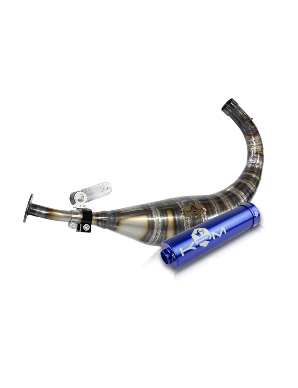 Le pot d'échappement KRM 80-90cc pour moteur AM6 est constitué de 15 pièces en tôle d'acier d'épaisseur 0.8 mm. Sa technique de fabrication est entièrement manuelle, chacune des pièces sont roulées puis soudées bord à bord au chalumeau avant d'être façonnées manuellement au marteau dans les ateliers KRM. Le pot KRM 80-90cc est très puissants et prévu pour de grosses configurations type 86cc Top performance. Il est destiné à une utilisation en compétition run ou piste uniquement. Il est l’aboutissement de mois de travail au banc d’essais afin offrir la meilleure des performances.