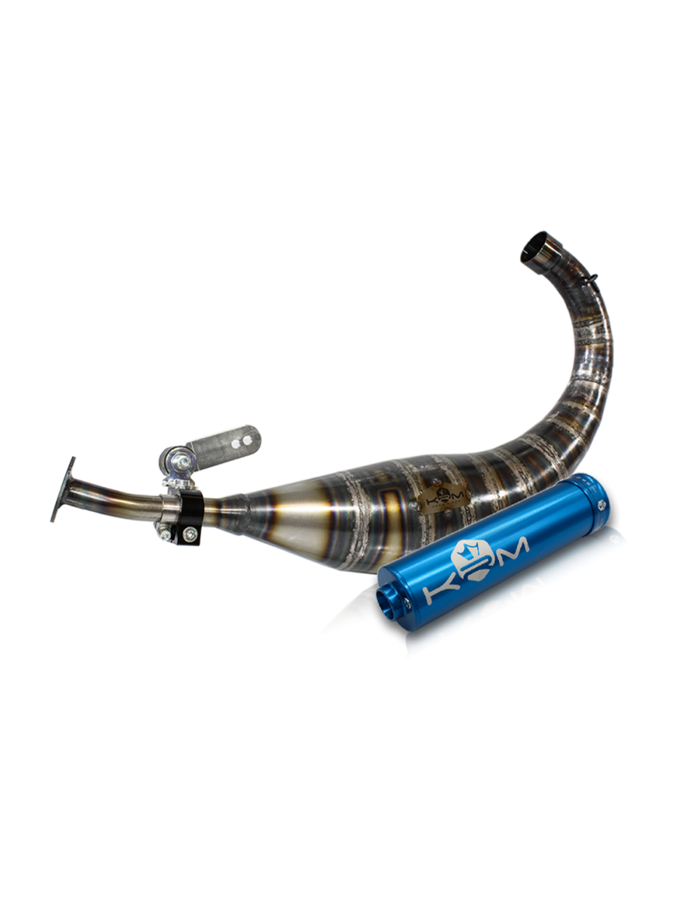 Le pot d'échappement KRM 90-100cc pour moteur Derbi est constitué de 15 pièces en tôle d'acier d'épaisseur 0.8 mm. Sa technique de fabrication est entièrement manuelle, chacune des pièces sont roulées puis soudées bord à bord au chalumeau avant d'être façonnées manuellement au marteau dans les ateliers KRM. Le pot KRM 90-100cc est très puissants et prévu pour de grosses configurations type 90/100cc 2fast ou 96cc Bidalot. Il est destiné à une utilisation en compétition run ou piste uniquement. Il est l’aboutissement de mois de travail au banc d’essais afin offrir la meilleure des performances.