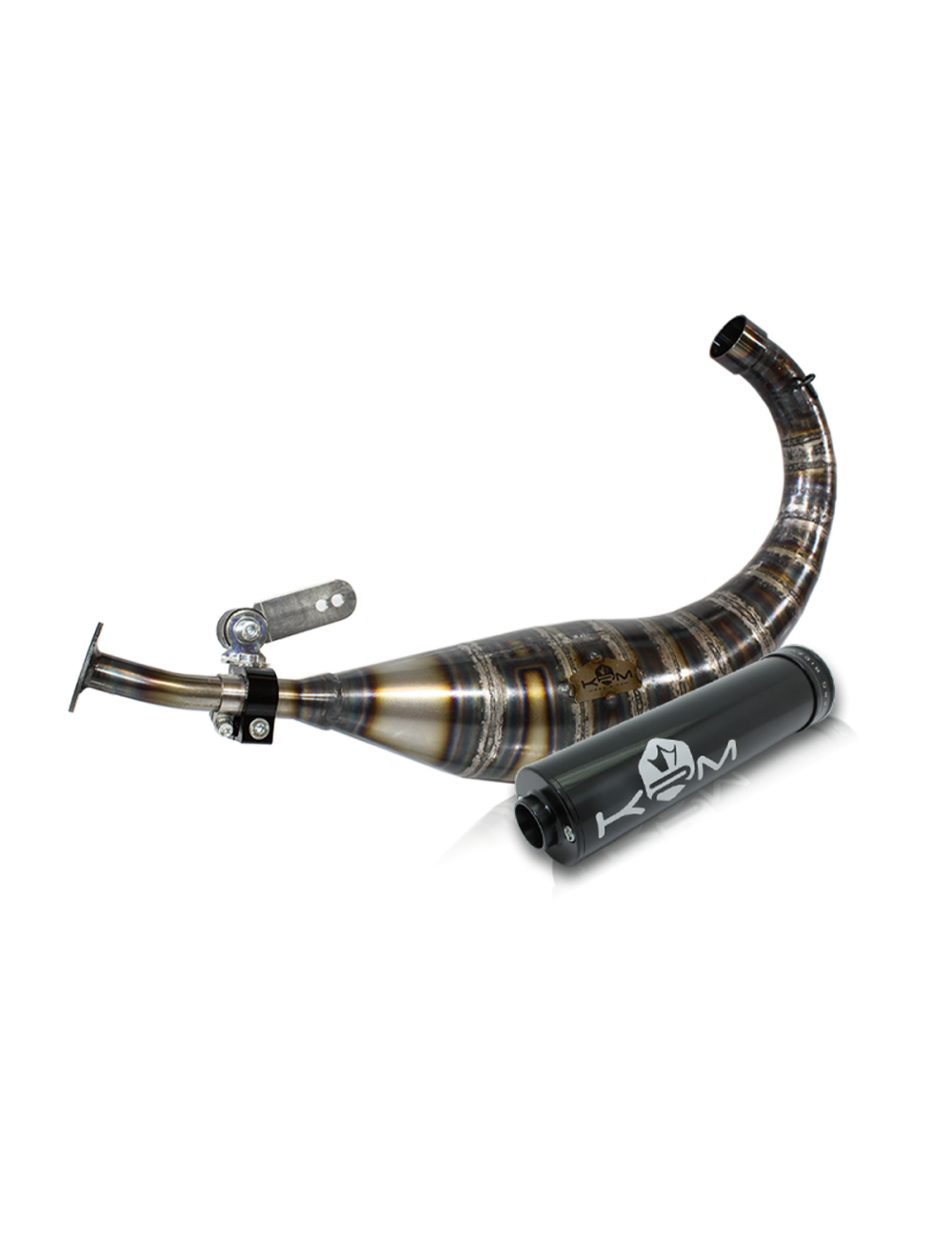 Le pot d'échappement KRM 90-100cc pour moteur Derbi est constitué de 15 pièces en tôle d'acier d'épaisseur 0.8 mm. Sa technique de fabrication est entièrement manuelle, chacune des pièces sont roulées puis soudées bord à bord au chalumeau avant d'être façonnées manuellement au marteau dans les ateliers KRM. Le pot KRM 90-100cc est très puissants et prévu pour de grosses configurations type 90/100cc 2fast ou 96cc Bidalot. Il est destiné à une utilisation en compétition run ou piste uniquement. Il est l’aboutissement de mois de travail au banc d’essais afin offrir la meilleure des performances.