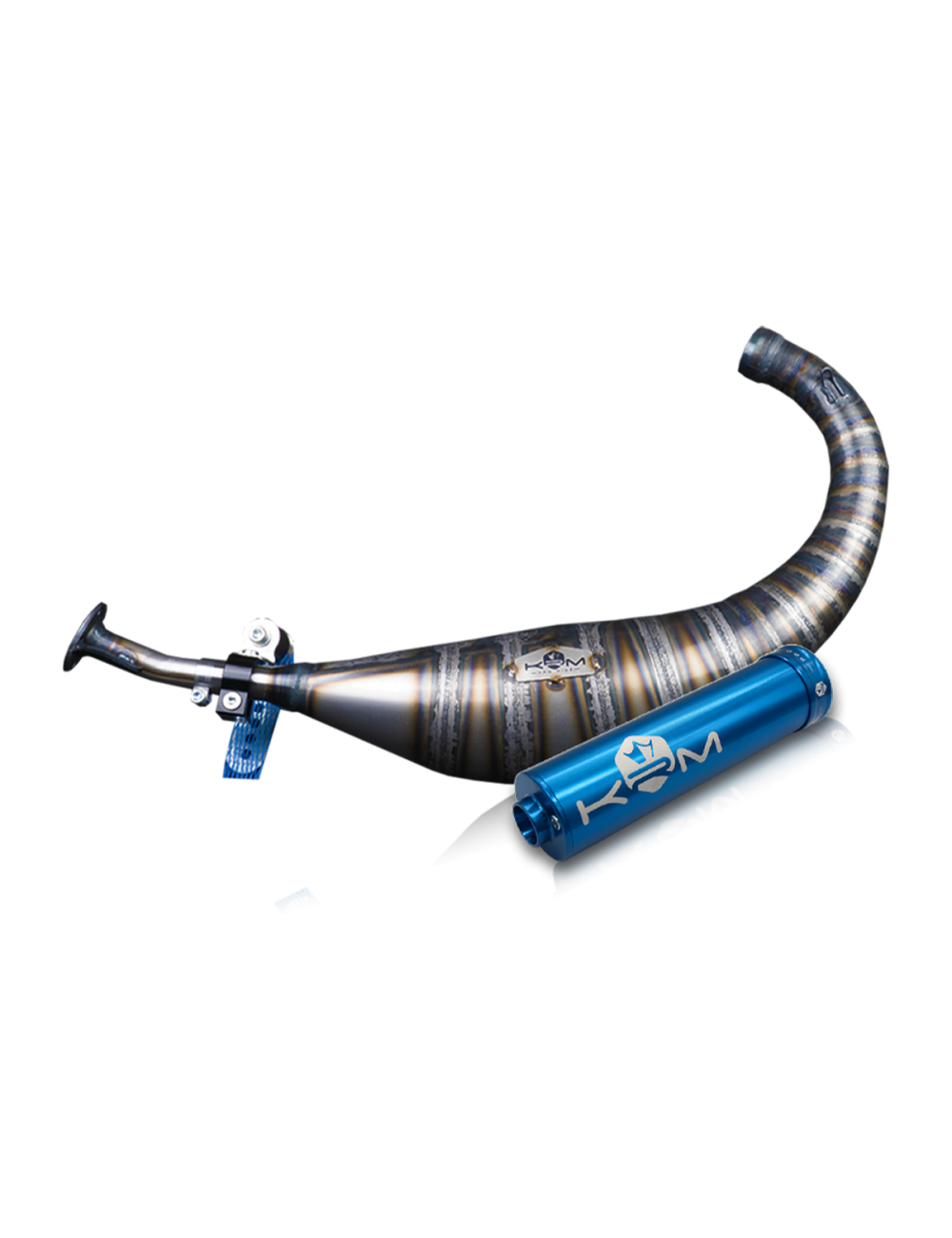 Le pot d'échappement KRM 100-115cc pour moteur Derbi est constitué de 18 pièces en tôle d'acier d'épaisseur 0.8 mm. Sa technique de fabrication est entièrement manuelle, chacune des pièces sont roulées puis soudées bord à bord au chalumeau avant d'être façonnées manuellement au marteau. Le pot KRM 100-115cc est très coupleux et puissant et prévu pour de très grosses configurations type 100cc 2fast ou 115cc LMR. Il est destiné à une utilisation en compétition run ou piste uniquement. Il est l’aboutissement de mois de travail au banc d’essais afin offrir la meilleure des performances.